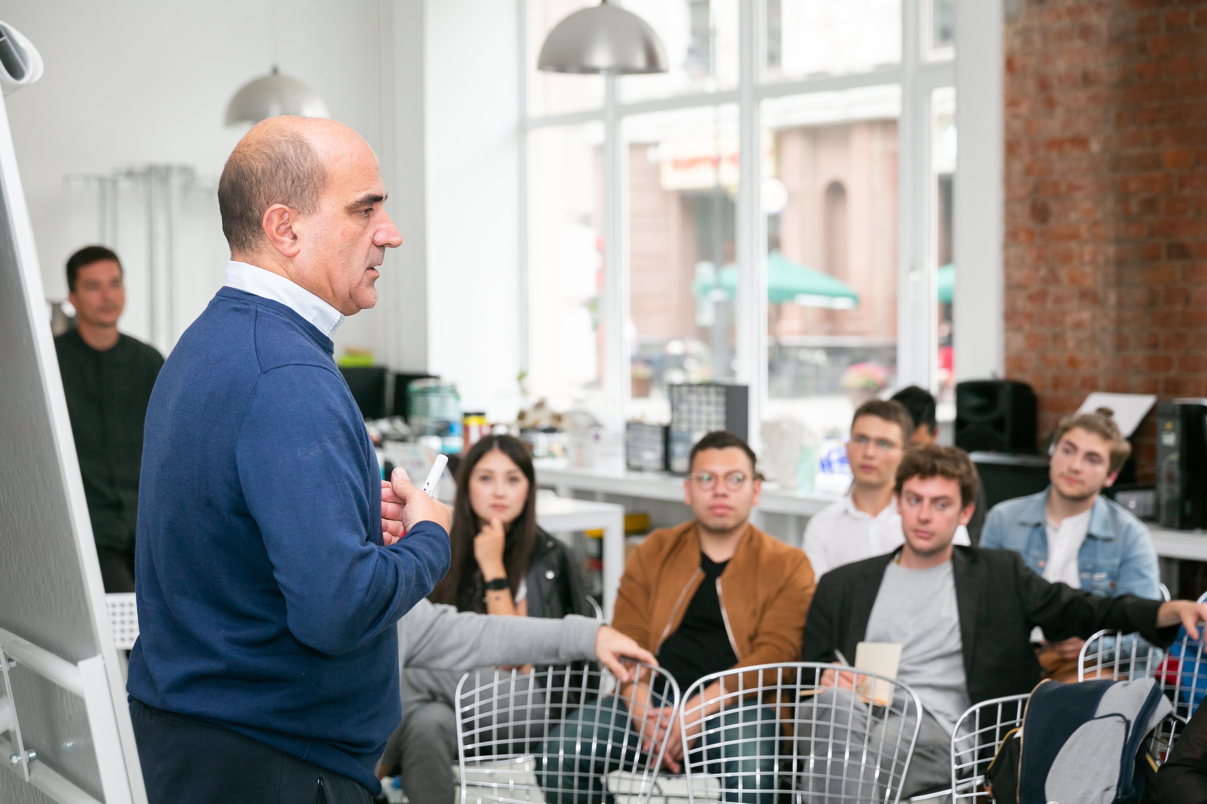 Студентов поприветствовали академический руководитель программы Висенте Гуаярт, заведующая лабораторией Шухов Лаб Надежда Рыжкова, декан Факультета городского и регионального развития НИУ ВШЭ Глеб Витков и директор Института экономики транспорта и транспортной политики НИУ ВШЭ Михаил Блинкин.
